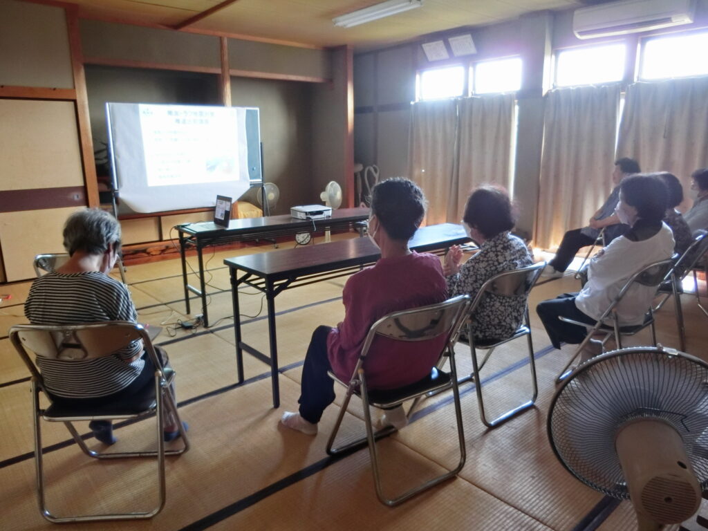 片地地区は津波リスクがない反面、周辺が山に囲まれており、南海トラフ地震では土砂災害の発生が懸念されている。そのため、講義では地震火災や土砂崩れへの対応も織り交ぜながら話しをしました。